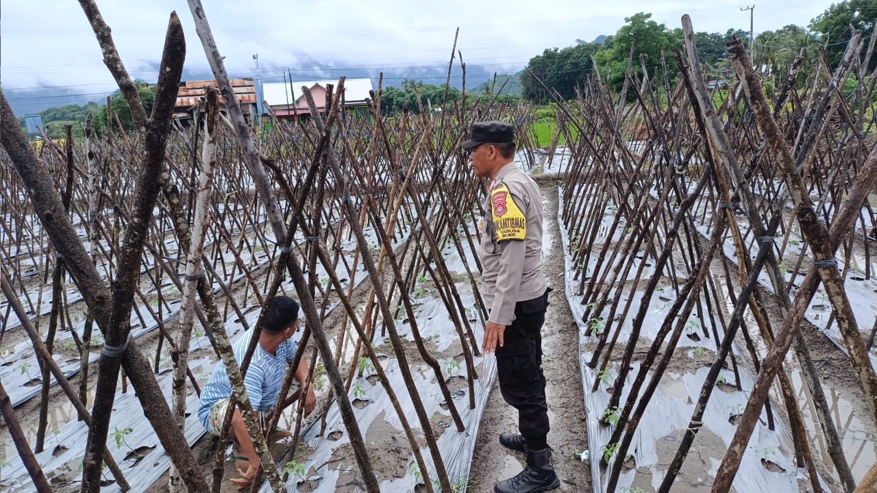 Bhabinkamtibmas Desa Tarusa, BRIPKA Heriyanto, melakukan sambang sekaligus memantau keberadaan tanaman tomat dan mentimun milik Bapak Aminollah yang ada di Desa Tarusa, Senin (10/02/25) pagi.