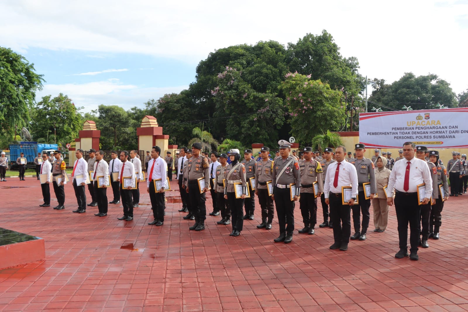 Sumbawa Besar-NTB, Kepolisian Resor Sumbawa melaksanakan upacara pemberian penghargaan (reward) dan Pemberhentian Tidak Dengan Hormat (PTDH) kepada personel, Selasa (12/02/2025) pagi.