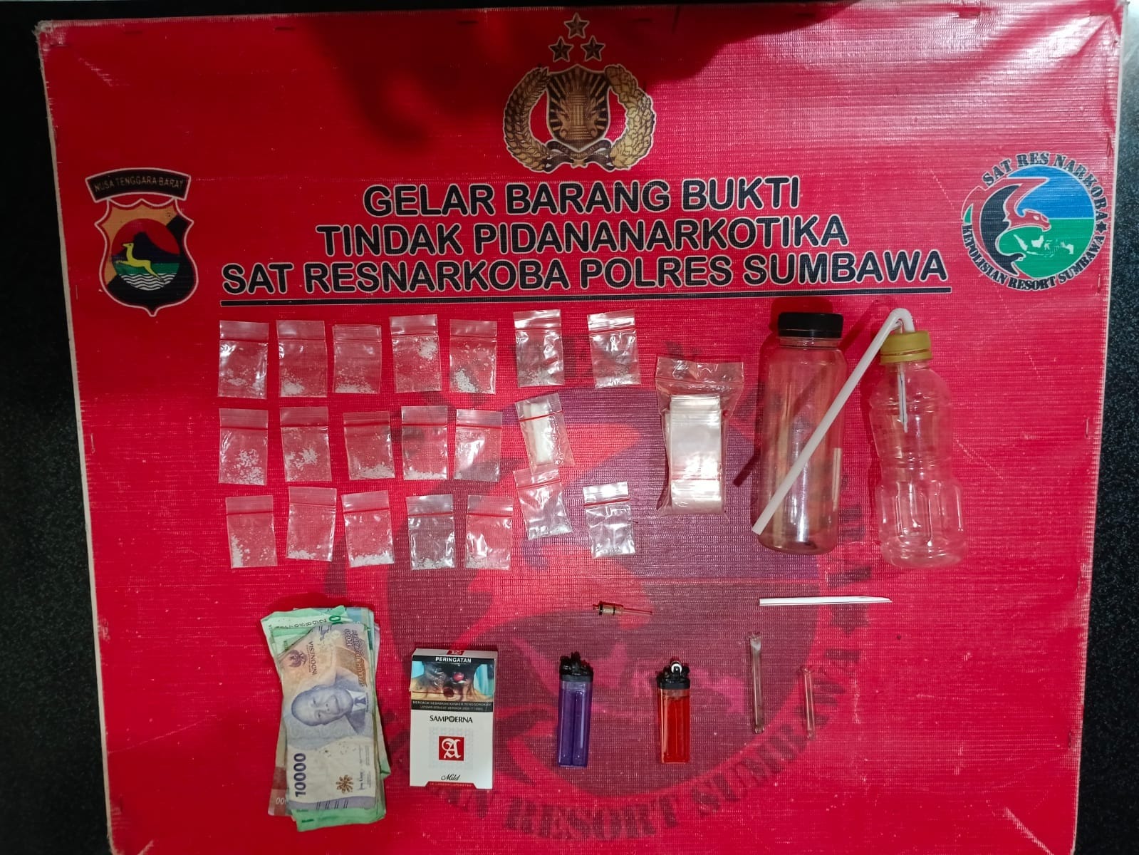 Sebanyak 20 poket narkotika yang diduga sabu dengan berat bruto 6,30 gram diamankan oleh petugas, beserta barang bukti lainnya seperti 1 bendel klip obat, 2 buah bong, 1 buah skop, 1 buah sumbu, 2 buah pipa kaca, 2 buah korek gas, dan 1 bungkus rokok merek Sampoerna.