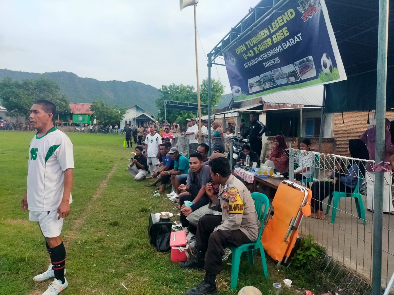 Sumbawa Barat, NTB – Kepolisian Sektor (Polsek) Brang Rea Resor Sumbawa Barat melaksanakan pengamanan pada Open Turnamen Sepak Bola Legend Cup U-42 X-Raider Bree yang berlangsung di Desa Sapugara Bree, Kecamatan Brang Rea, Kabupaten Sumbawa Barat, pada Rabu, 21 Mei 2025, bertempat di Lapangan Lembang Basir, Dusun Bree.
