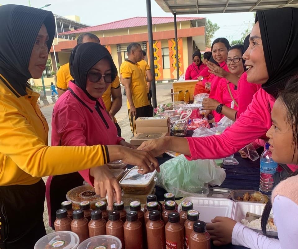 LOMBOK UTARA – Sejumlah produk hasil kreasi Usaha Mikro Kecil Menengah (UMKM) Bhayangkari Cabang Lombok Utara hiasi olah raga bersama di Polres Lombok Utara, Selasa (24/6/2025).