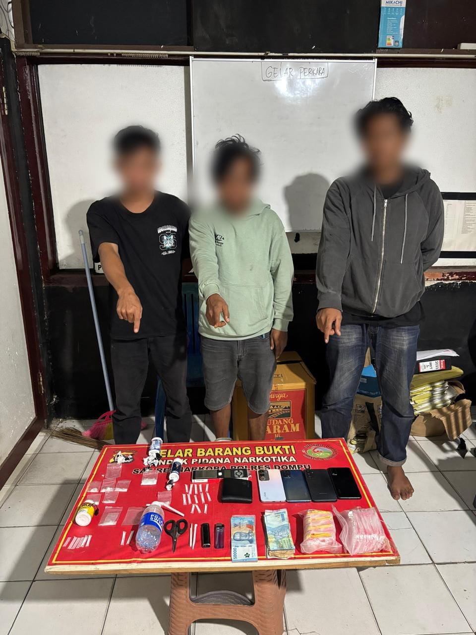 Tim Opsnal Satresnarkoba Polres Dompu berhasil mengamankan tiga orang terduga pelaku penyalahgunaan narkotika jenis sabu di wilayah Kecamatan Pekat, Kabupaten Dompu. Penangkapan dilakukan pada Kamis (14/8/2025) dini hari sekitar pukul 01.30 WITA setelah sebelumnya ketiga terduga diamankan oleh jajaran Polsek Pekat.