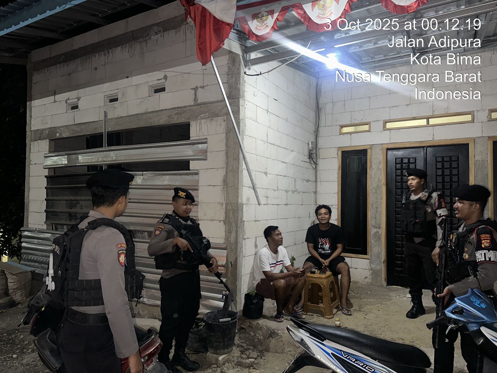 Bima Kota, NTB (03 September 2025) – Demi menjaga situasi keamanan dan ketertiban masyarakat (Kamtibmas) tetap aman dan kondusif, Satuan Samapta Polres Bima Kota melaksanakan Patroli Kegiatan Rutin yang Ditingkatkan (KRYD) dengan menyambangi warga, Jum,at (2/10/2025) pukul 00.07 Wita.
