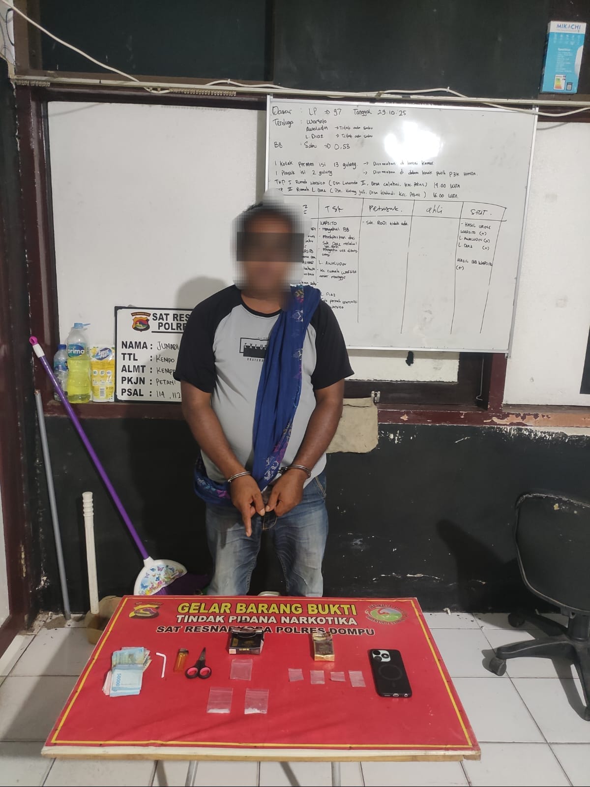 Tim Opsnal Satresnarkoba Polres Dompu kembali menunjukkan komitmennya dalam memberantas peredaran gelap narkotika di wilayah Kabupaten Dompu. Pada Senin malam (3 November 2025) sekitar pukul 21.00 Wita, petugas berhasil meringkus seorang pria berinisial A (43) di Dusun Pancasila, Desa Tambora, Kecamatan Pekat, Kabupaten Dompu, yang diduga kuat sebagai pengedar sabu-sabu.