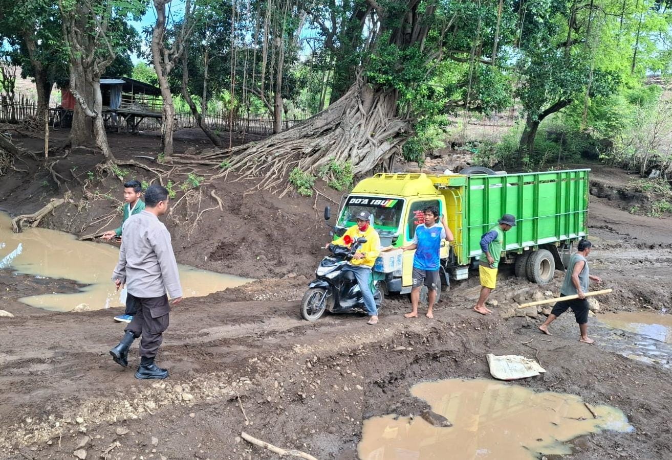 Tidak saja melakukan pengaturan arus lalulintas petugas juga membantu mendorong SPM pemotor yang terjebak Lumpur.