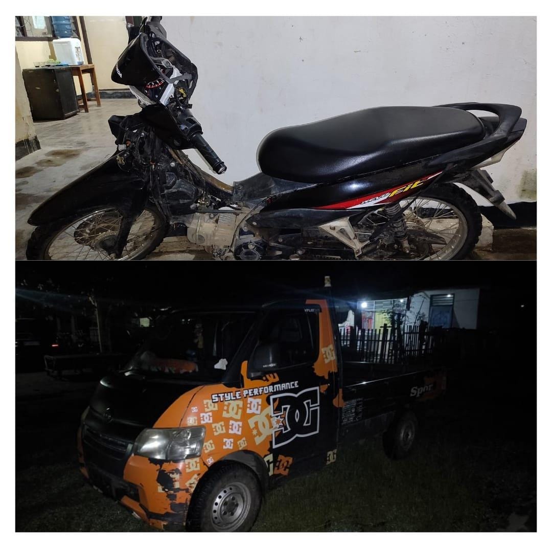 Personel Polsek Sanggar Polres Bima Polda NTB evakuasi korban Kecelakaan Lalulintas ganda yang melibatkan Sepeda Motor dan Mobil Pickup terjadi di jalan Lintas Sandue – Sanggar tepatnya di jalan depan TPU Desa Sandue Kecamatan Sanggar Kabupaten Bima.