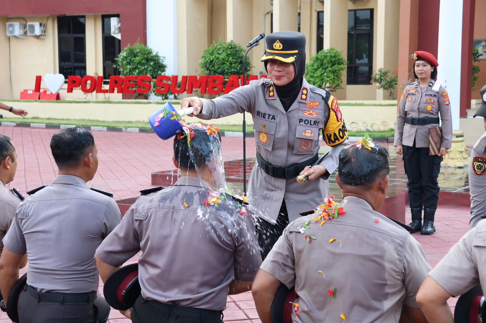 Upacara dipimpin langsung oleh Kapolres Sumbawa, AKBP Marieta Dwi Ardhini, S.H., S.I.K., didampingi Wakapolres KOMPOL Didik Harianto, S.H., dan Wadanyon B Pelopor AKP Nurdin, S.AP., M.M.Inov. Turut hadir Pejabat Utama (PJU) Polres Sumbawa serta pengurus Bhayangkari Cabang Sumbawa yang mendampingi para suami/istri yang naik pangkat.