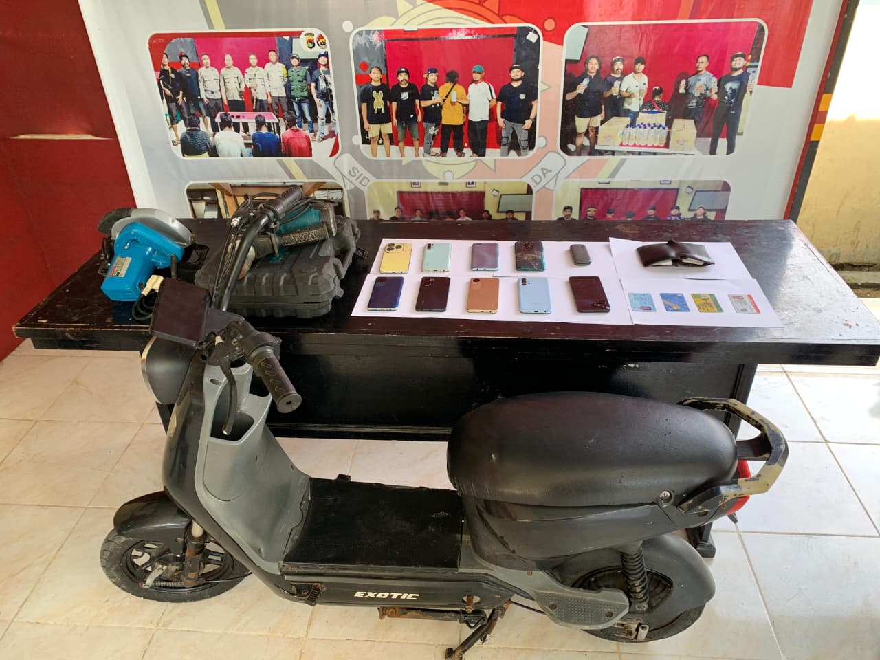 Dari tangan terduga pelaku, polisi berhasil mengamankan barang bukti berupa 9 unit handphone berbagai merek, yakni OPPO A17K warna krem, Infinix Hot 40 Pro warna Horizon Gold, Redmi warna biru, OPPO A12 warna biru, OPPO A16K warna biru, Samsung Galaxy A32 warna biru, Vivo Y30 warna biru, Realme warna hitam, serta 1 unit sepeda listrik merek Exotic warna hitam.