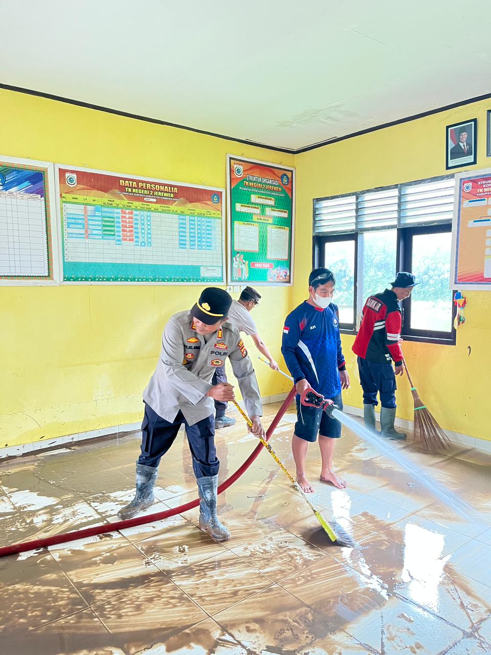 Gotong royong yang dilaksanakan Respon dan kepedulian Polri terhadap fasilitas pendidikan yang terdampak banjir pasca hujan dengan intensitas yang cukup tinggi.