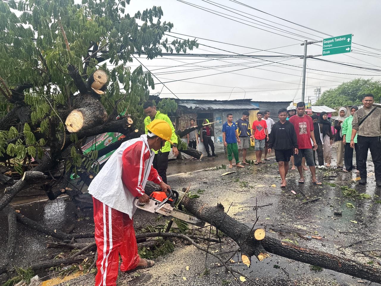 Pohon tersebut tumbang akibat hujan lebat disertai angin kencang, menyebabkan seluruh badan jalan tertutup dan menghambat arus lalu lintas, serta berpotensi membahayakan keselamatan pengguna jalan.