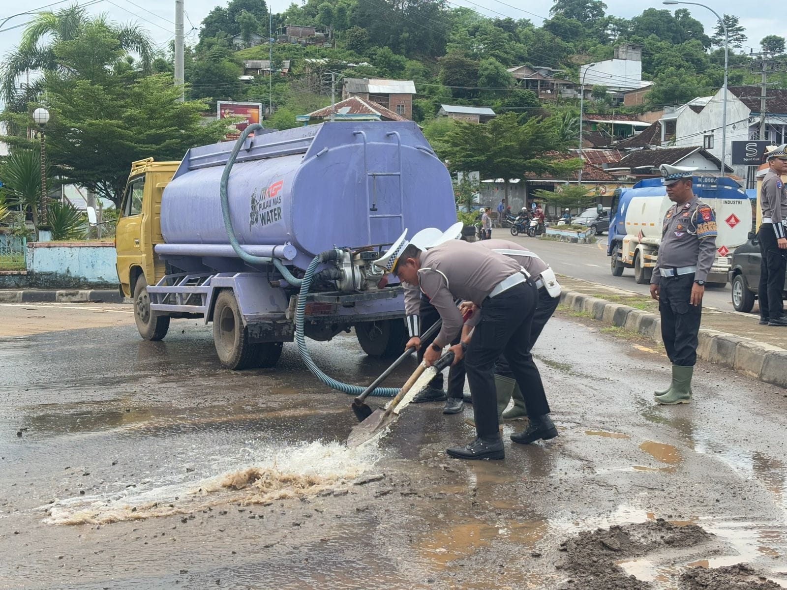Dalam kegiatan tersebut, Sat Lantas Polres Sumbawa mengerahkan satu unit mobil tanki air untuk menyiram dan membersihkan jalan dari material tanah dan lumpur hingga bersih. Tujuan dari kegiatan ini adalah untuk memastikan bahwa jalan dapat dilalui dengan aman oleh pengendara, serta untuk melancarkan arus lalu lintas.