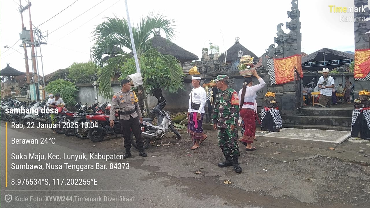 Pada kali ini, Bhabinkamtibmas Desa Sukamaju, Saparwadi Ario, bersama dengan Babinsa Sertu M. Arifin, bersama Anggota Polsek Lunyuk, melaksanakan pengamanan kegiatan keagamaan warga binaan di Pura Penataran Ped, Desa Sukamaju.Rabu (22/01/25) pagi.