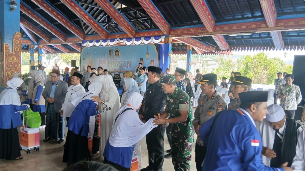 Acara pelepasan dilanjutkan dengan pembacaan doa oleh Ustadz H. Amar Hadi, S.Ag., yang memohon keselamatan dan kemudahan bagi seluruh jamaah selama berada di Tanah Suci. Suasana semakin mengharukan saat jamaah berpamitan kepada keluarga dan para pejabat, saling bersalaman diiringi doa tulus dan linangan air mata.